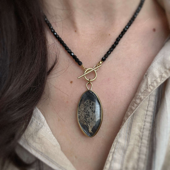 The Andromeda Collection pendants are tiny galaxies of their own — crafted from brass, recycled wine bottle glass, a piece of kombucha SCOBY, and delicate dried flowers preserved beneath the glass. The SCOBY forms a unique cosmic backdrop, giving depth and contrast to each flower suspended within.