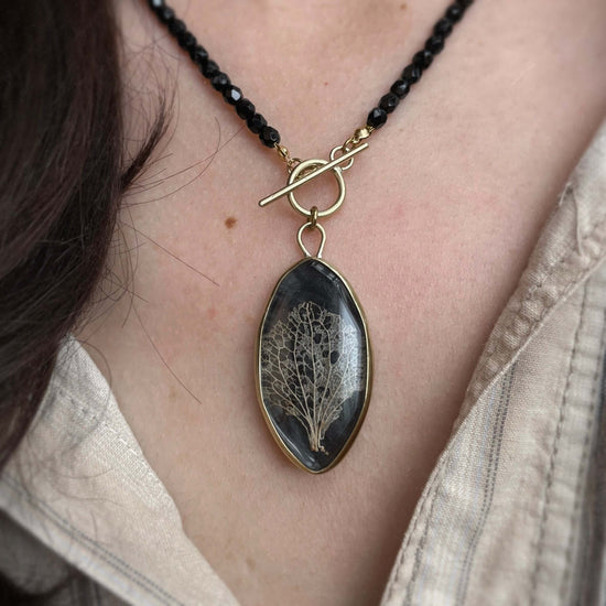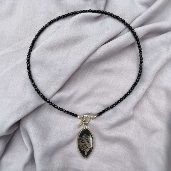 The pendant is threaded onto hand-selected black faceted Czech glass beads, 45 cm in length, adding subtle sparkle and elegance.